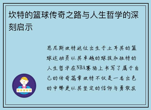 坎特的篮球传奇之路与人生哲学的深刻启示