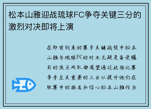 松本山雅迎战琉球FC争夺关键三分的激烈对决即将上演