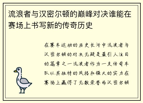 流浪者与汉密尔顿的巅峰对决谁能在赛场上书写新的传奇历史